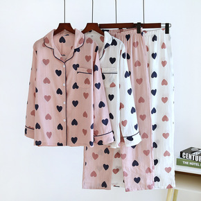 梭织棉双层纱布妈妈款爱心睡衣套装春秋季薄款长袖长裤...
