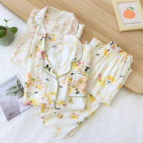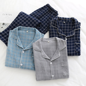 棉质水洗双层纱布睡衣套装女四季薄款长袖长裤翻领大码...
