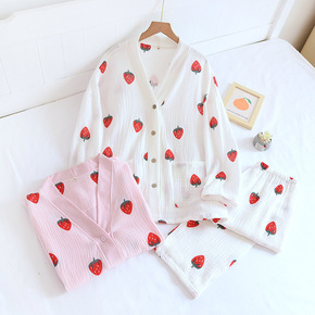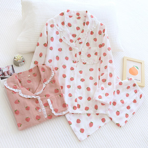 白花边翻领睡衣套装女棉质加密纱布小草莓四季薄款长袖...