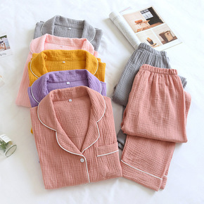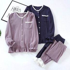 V领绉布睡衣套装女棉质双层纱布四季薄款长袖长裤开衫...