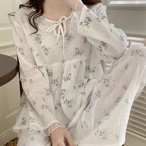 水洗绉布小蜜桃V领梭织棉双层纱睡衣套装女春薄款长袖...