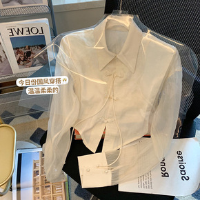 设计感复古国风短款长袖衬衫女2022年夏季新款新中...