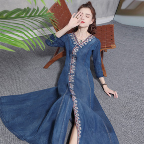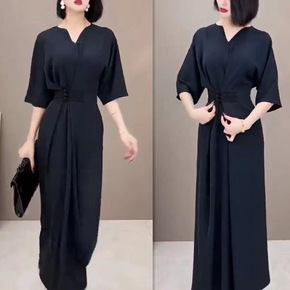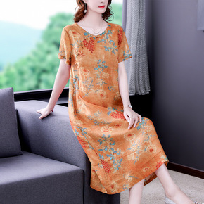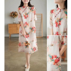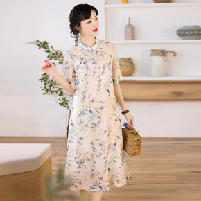 2022新款轻中式女装 轻薄苎麻印花盘扣中袖长款连...