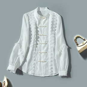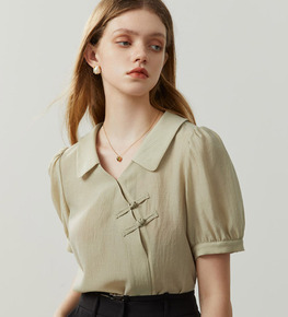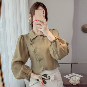 2022年早秋新款长袖衬衫雪纺衫盘扣翻领设计感时尚...
