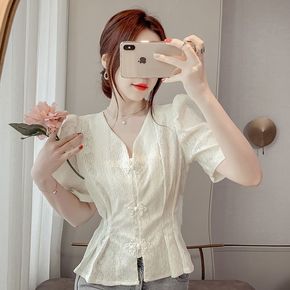 法式V领盘扣泡泡袖蕾丝衬衫女2022年夏季新款时尚...