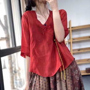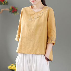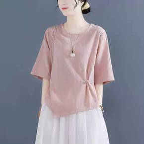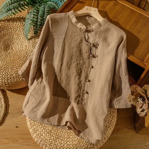 中国风盘扣棉麻上衣女文艺复古七分袖民族风套头衬衣高...