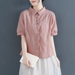 2022新品盘扣复古中国风翻领纯色棉麻短袖衬衫女文...
