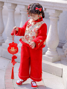 汉服女童冬装红色中国风加绒加厚阔腿裤套装小女孩喜庆...