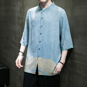 夏季浮世绘道袍七分袖衬衫中国风海浪鲤鱼日系薄款宽松...