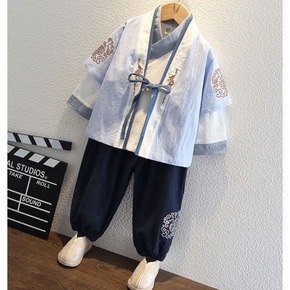 中国风唐装汉服休闲棉麻套装青少年纯色刺绣盘扣V领T...