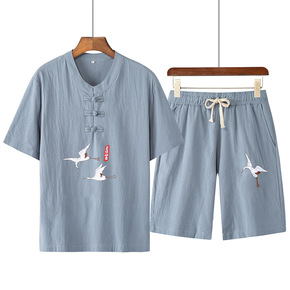 夏季短袖T恤套装2022中国风复古仙鹤刺绣休闲短裤...