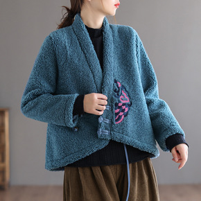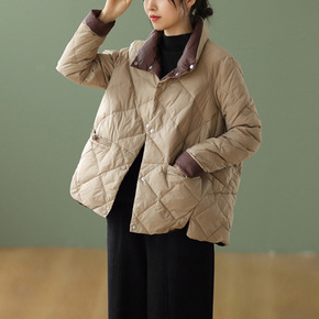 2021秋冬新款文艺复古休闲显瘦菱形格拼色立领盘扣...