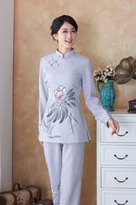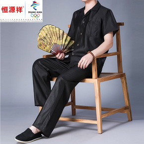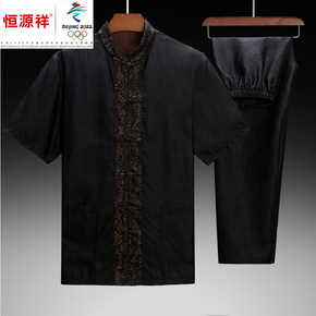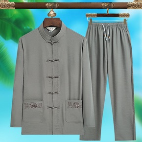 春夏仿棉麻唐装男长袖套装中老年仿亚麻爸爸装中式大码...