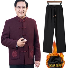 羊毛呢唐装男汉服中老年民族风大码加棉爸爸毛呢外套中...