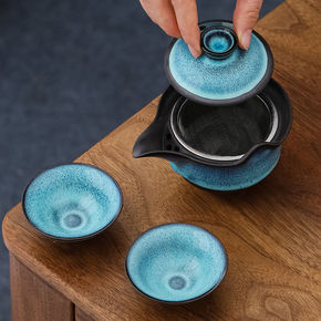 日式复古粗陶提梁壶功夫茶具套装一壶两杯茶壶干泡茶盘...