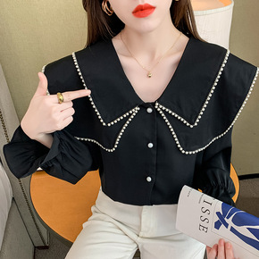 早秋白色蕾丝衫女2021年春秋新款别致薄款娃娃领长...
