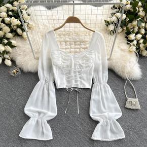 蕾丝衫女秋季宽松显瘦薄款微透喇叭袖上衣洋气百搭褶皱...