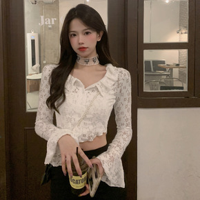 纯欲性感娃娃领镂空钩花蕾丝衫帒印秋季新款百搭修身显...