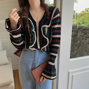 韩版复古v领长袖针织衫撞色鬼马系喇叭木耳边套头设计...