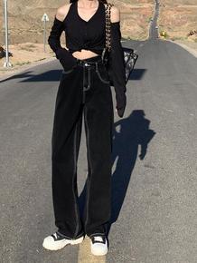 黑色牛仔裤女夏季2022新款小个子宽松高腰阔腿拖地...