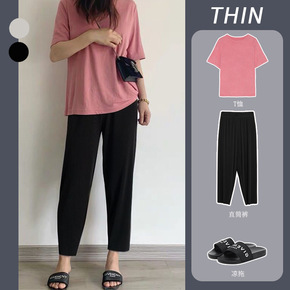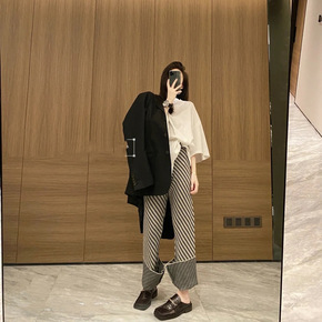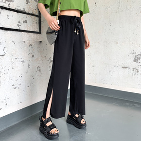 2022韩版宽松春夏季款侧开叉直筒阔腿裤高腰显瘦百...