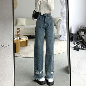 高腰破洞直筒牛仔裤女春季2022新款高街宽松显瘦减...