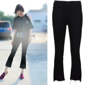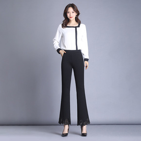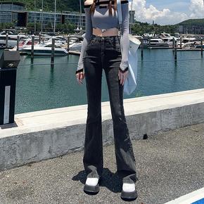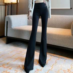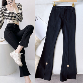 时髦设计修身显瘦开叉喇叭裤女高弹力紧身大长腿黑色裤...