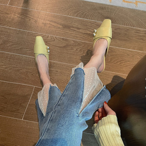 网纱拼接微喇牛仔裤女2022年春夏新款时尚弹力高腰...
