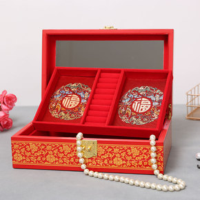中式陪嫁首饰盒木质新娘嫁妆结婚梳妆盒喜庆大红色双喜...
