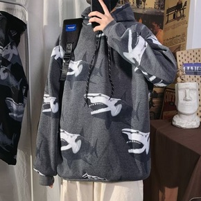 美式ins高街鲨鱼印花连帽卫衣男春秋季潮牌嘻哈宽松...