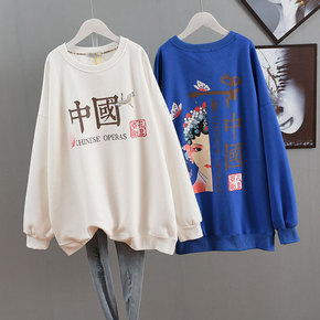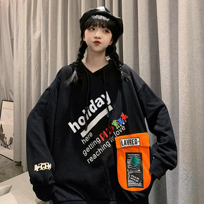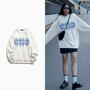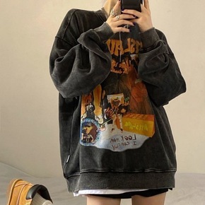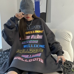 美式hiphop潮牌黑色圆领卫衣女宽松国潮over...