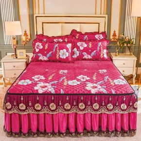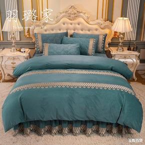 冬季欧式水晶绒夹棉床裙无床尾蕾丝床罩四件套珊瑚绒双...