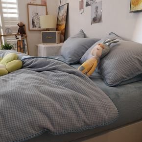 简约纯色加厚牛奶绒四件套轻奢千鸟格保暖珊瑚绒被套秋...