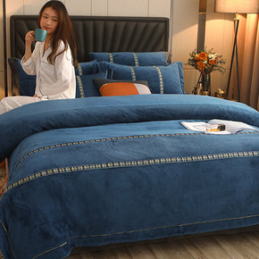 欧式冬季珊瑚绒四件套拼接牛奶绒绒法兰绒简约纯色刺绣...