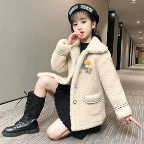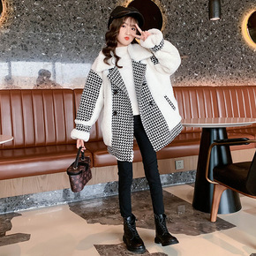 厂家直销女童千鸟格外套夹棉大衣中长款羊羔绒加绒双排...