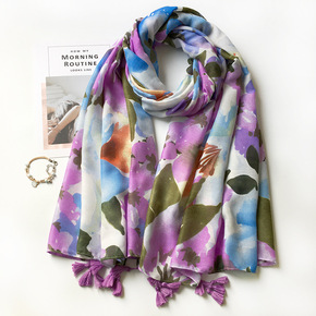 复古名族风紫色花卉缎棉棉麻手感手工辫子须沙滩巾披肩...