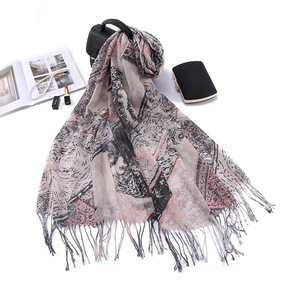 春秋新款围巾披肩棉麻女手工挂须印花民族风旅游披肩丝...