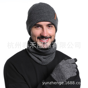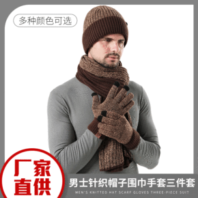 外贸欧美男士提花针织帽围脖手套三件套装户外加绒保暖...