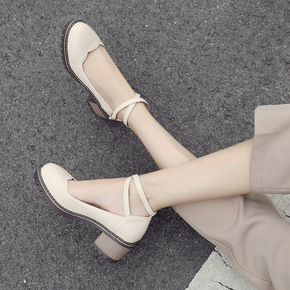 2021新款韩版甜美蝴蝶结丁字扣学生鞋高跟鞋粗跟单...