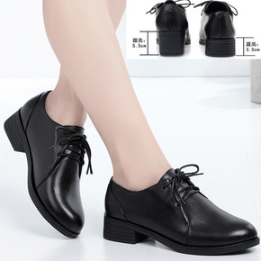 秋季真皮单鞋中跟女士皮鞋系带女鞋粗跟中年妈妈鞋大码...