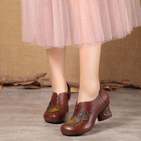 才毛2021春季新款低跟圆头单鞋 复古民族风真皮镂...