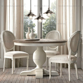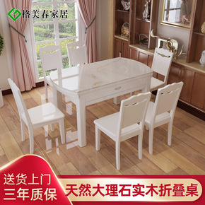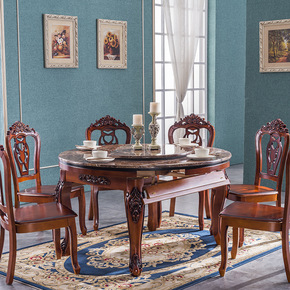 美式风格大理石伸缩餐桌椅组合实木雕花可折叠圆形餐桌...