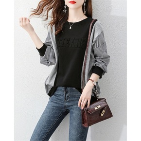 2021年超火假两件套头卫衣女春秋韩版新款格子休闲...