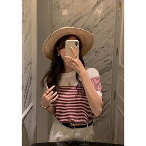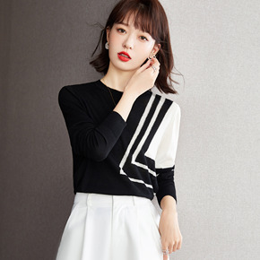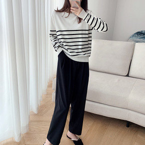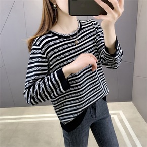 2021春装韩版新款针织衫女装显瘦条纹上衣低领中袖...
