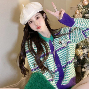 洋气少女风撞色毛衣外套女春秋设计感小众慵懒上衣温柔...