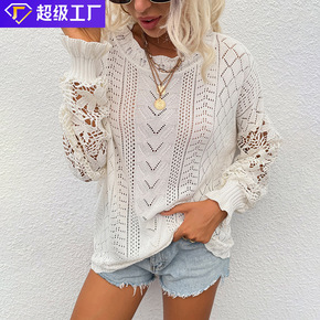毛毛雨跨境女装秋冬2022蕾丝花边拼接针织衫亚马逊...