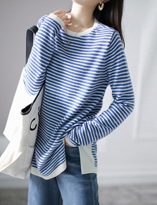 日系小清新蓝白撞色条纹针织衫女早春款圆领套头宽松休...