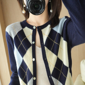 千鸟格圆领毛衣外套女长袖早春2022新款港味chi...