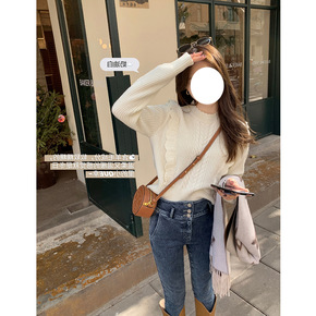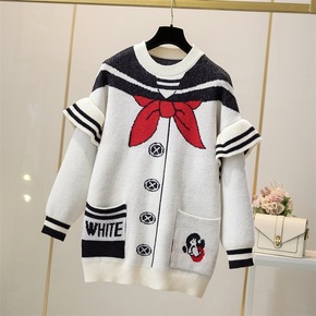 2021冬季套头拼色白兔卡通风木耳边学生毛衣女针织...