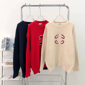 21冬欧美潮牌小香风双C字母刺绣羊羔绒圆领毛衣女简...